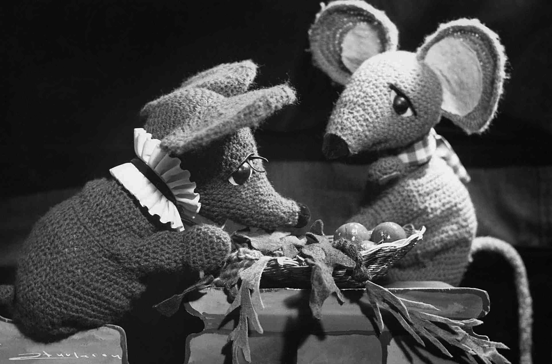 In the photo: The glove puppets Hjemmusa (The Home Mouse) and Fjellmusa (The Mountain Mouse)