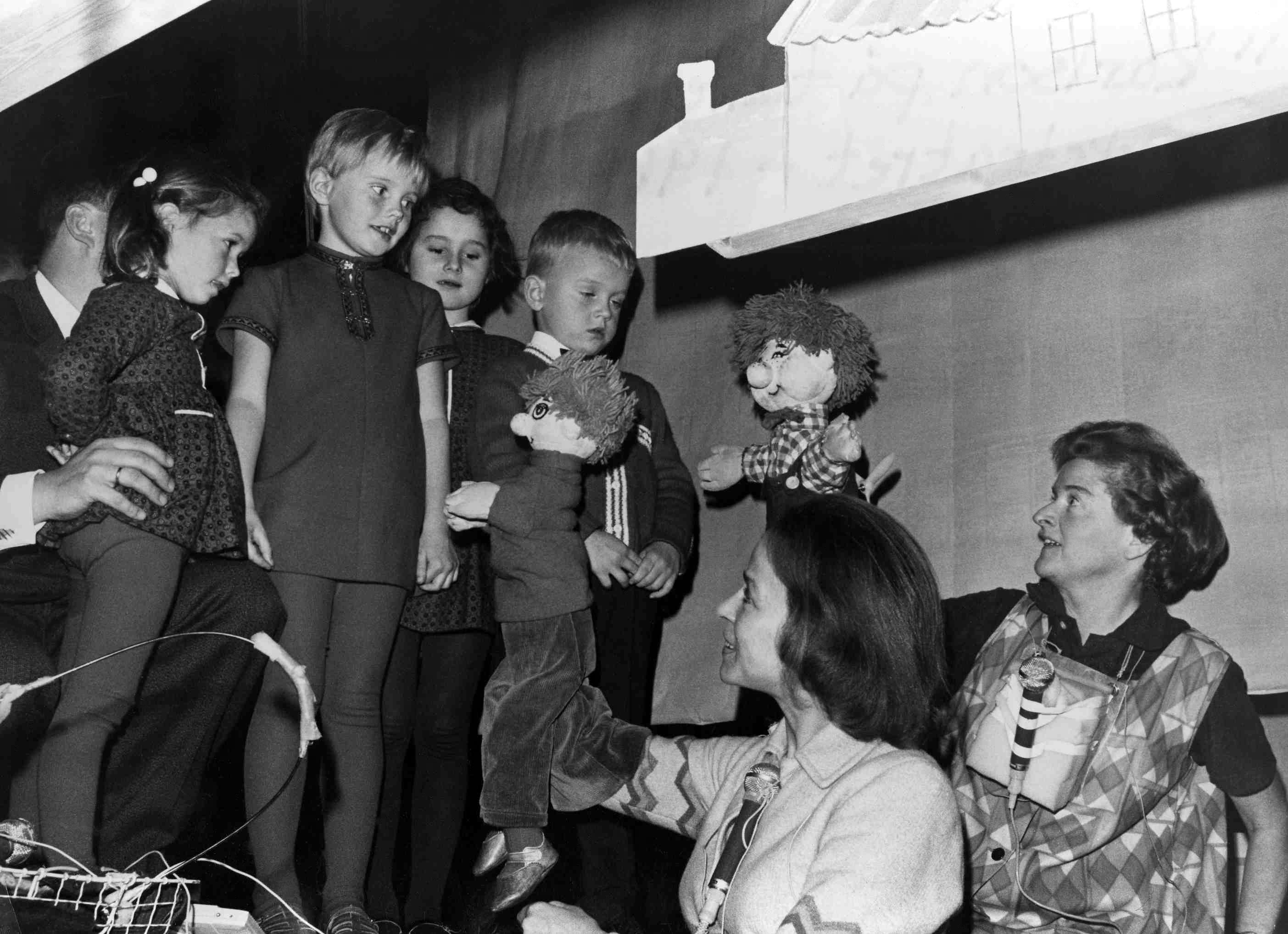 In the photo: Children, Rigmor Lange with the puppet Eric, Irene Thomsen with the puppet Karlsson