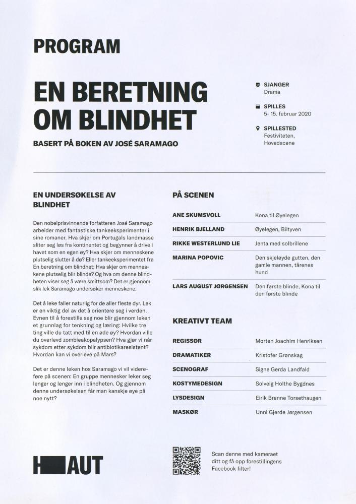 Forestillingsprogram for Haugesund Teaters produksjon En beretning om blindhet (2020)