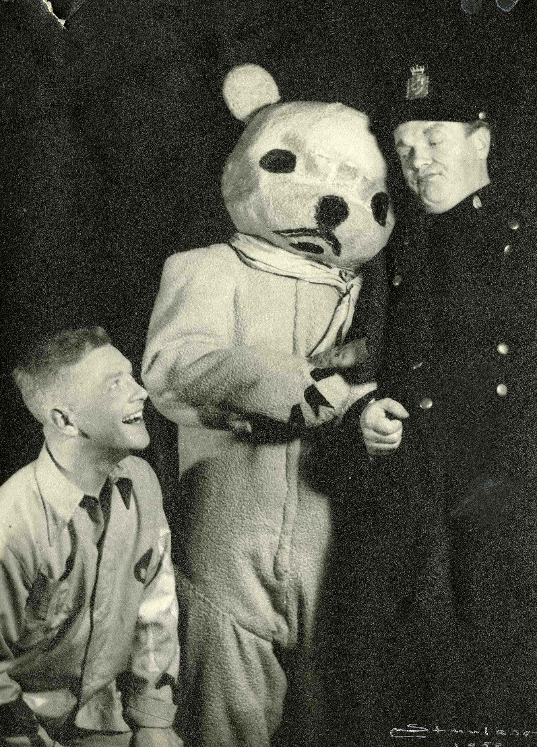 In the photo: Unknown, Rolf Søder as the teddy bear and Willie Hoel as police