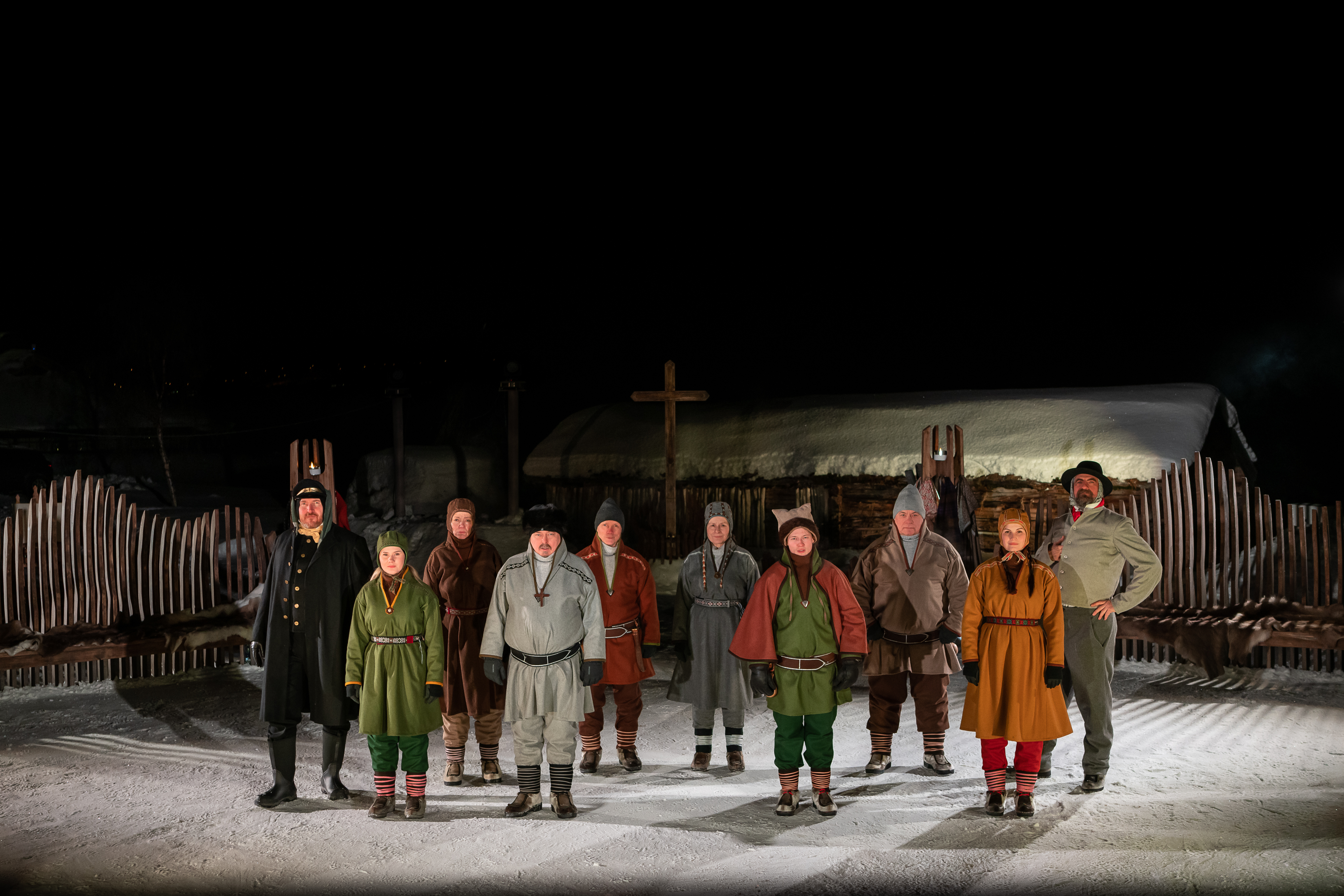 In the photo: Jakob Hultcrantz, Eila Ballovara Varsi, Anitta Suikkari, Nils Henrik Buljo, Iŋgor Ántte Áilu Gaup, Mary Sarre, Emil Karlsen, Egil Keskitalo, Marte Fjellheim Sarre, Paul Ottar Haga (Ensemble, Guovžža vuoššat)