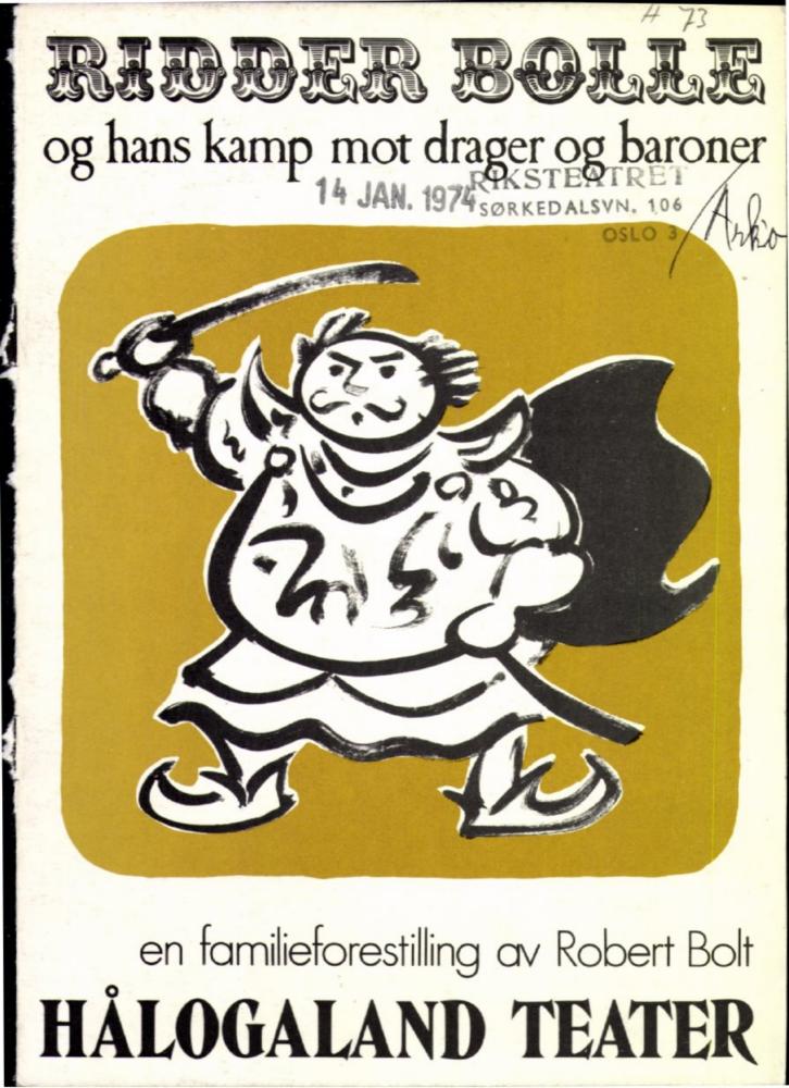 Forestillingsprogram for Hålogaland Teaters produksjon Ridder Bolle og hans kamp mot drager og baroner (1973).