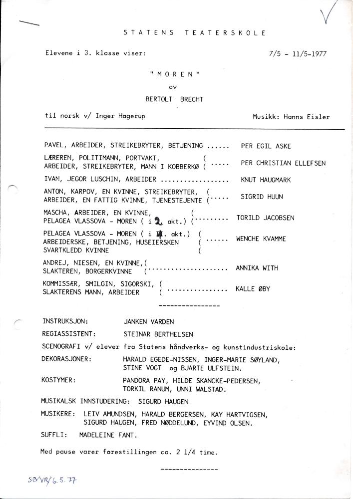 Program til Statens teaterskoles elevvisning Moren (1977)