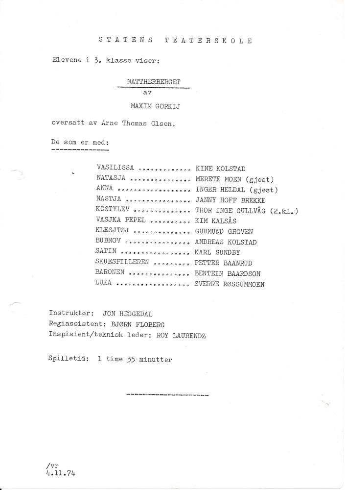 Program fra Statens teaterskoles elevvisning Nattherberget (1974) med 3.klasse skuepillerutdanningen.