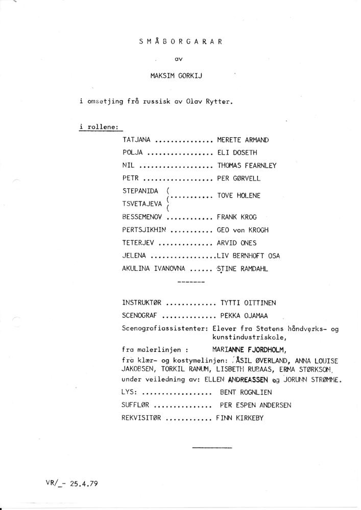 Program fra Statens teaterskoles visning av Småborgarar (1979)