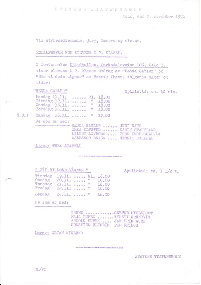 Invitasjon til Statens teaterskoles elevvisning Når vi døde vågner (1974)