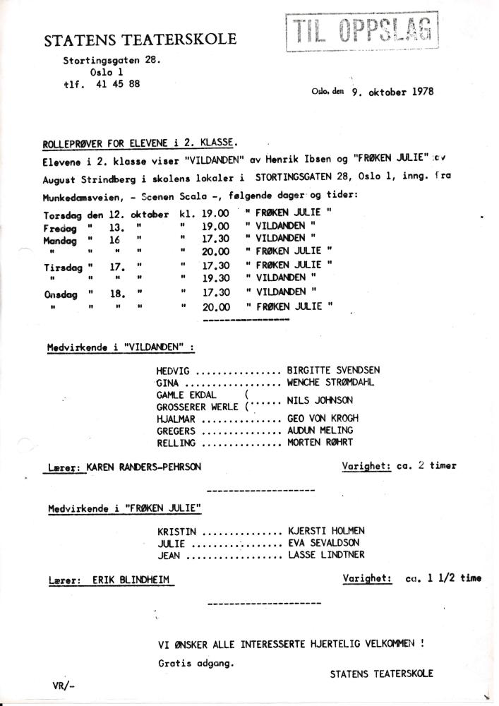 Invitasjon til Statens teaterskoles elevvisning Frøken Julie(1978)