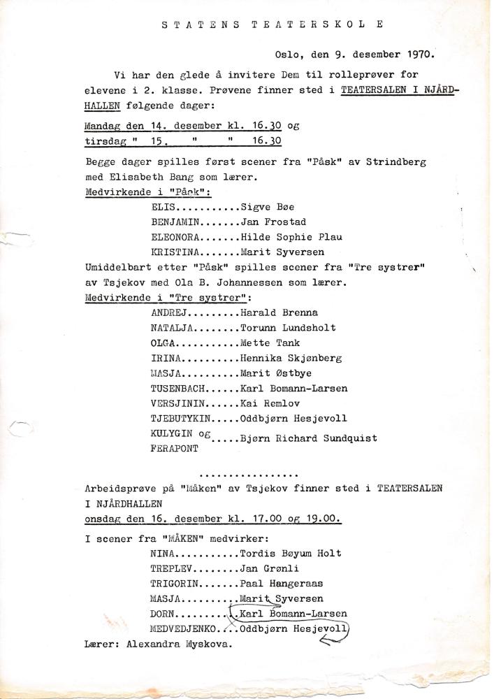 Invitasjon til Statens teaterskoles elevvisning Tre systrer(1970)