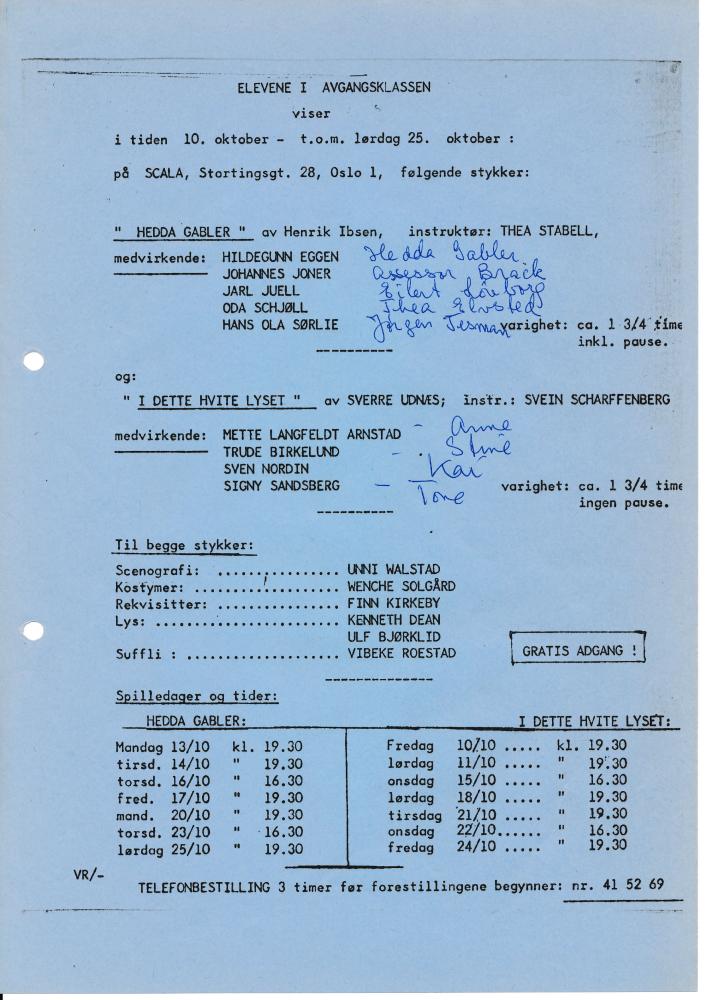 Invitasjon til Statens teaterskoles elevvisninger I dette hvite lyset og Hedda Gabler (1980)