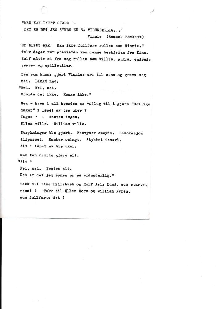 Program til Statens teaterskoles produksjon Deilige dager (1981)