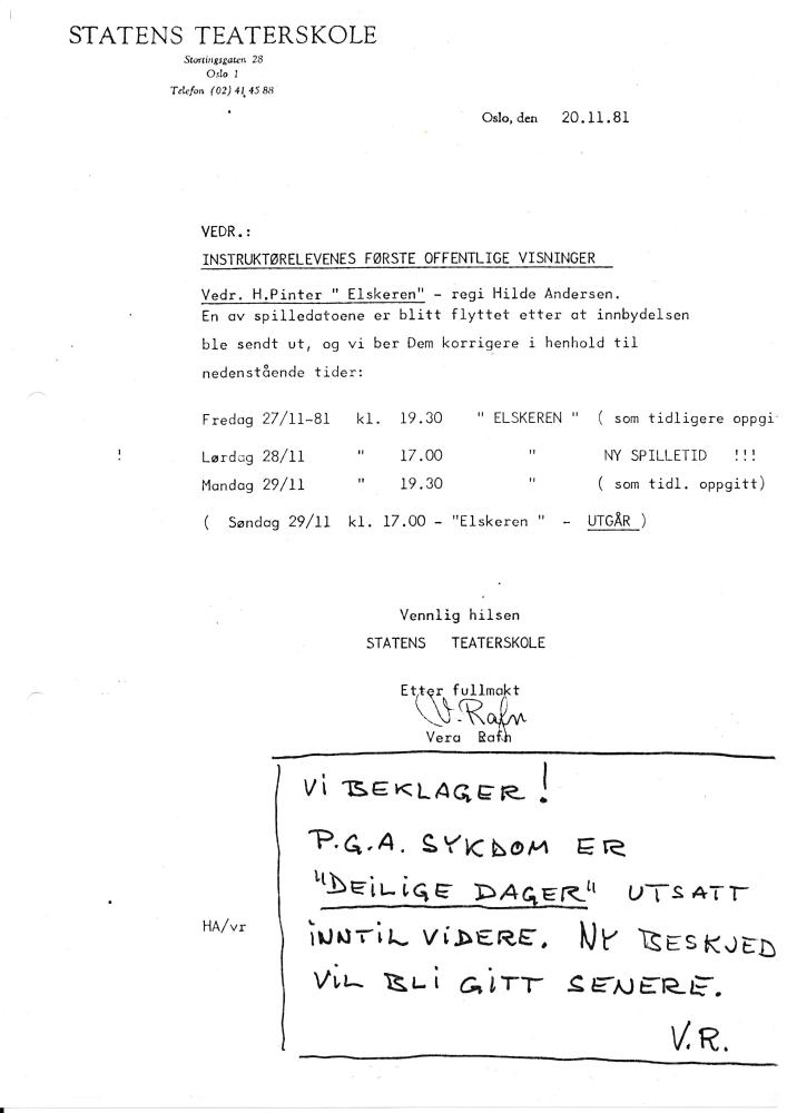 Invitasjon til Statens teaterskoles produksjon Elskeren (1981)