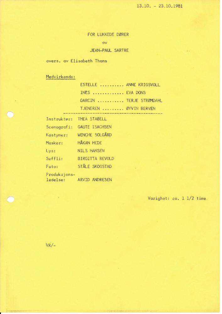 Program til Statens teaterskoles produksjon For lukkede dører (1981).