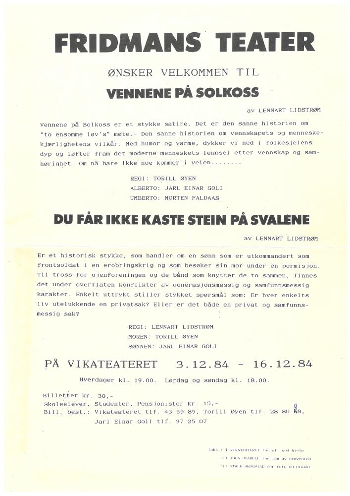 Program for Fridmans Teaters produksjoner Vennene på Solkoss (984) og Du får ikke kaste stein på svalene (1984).