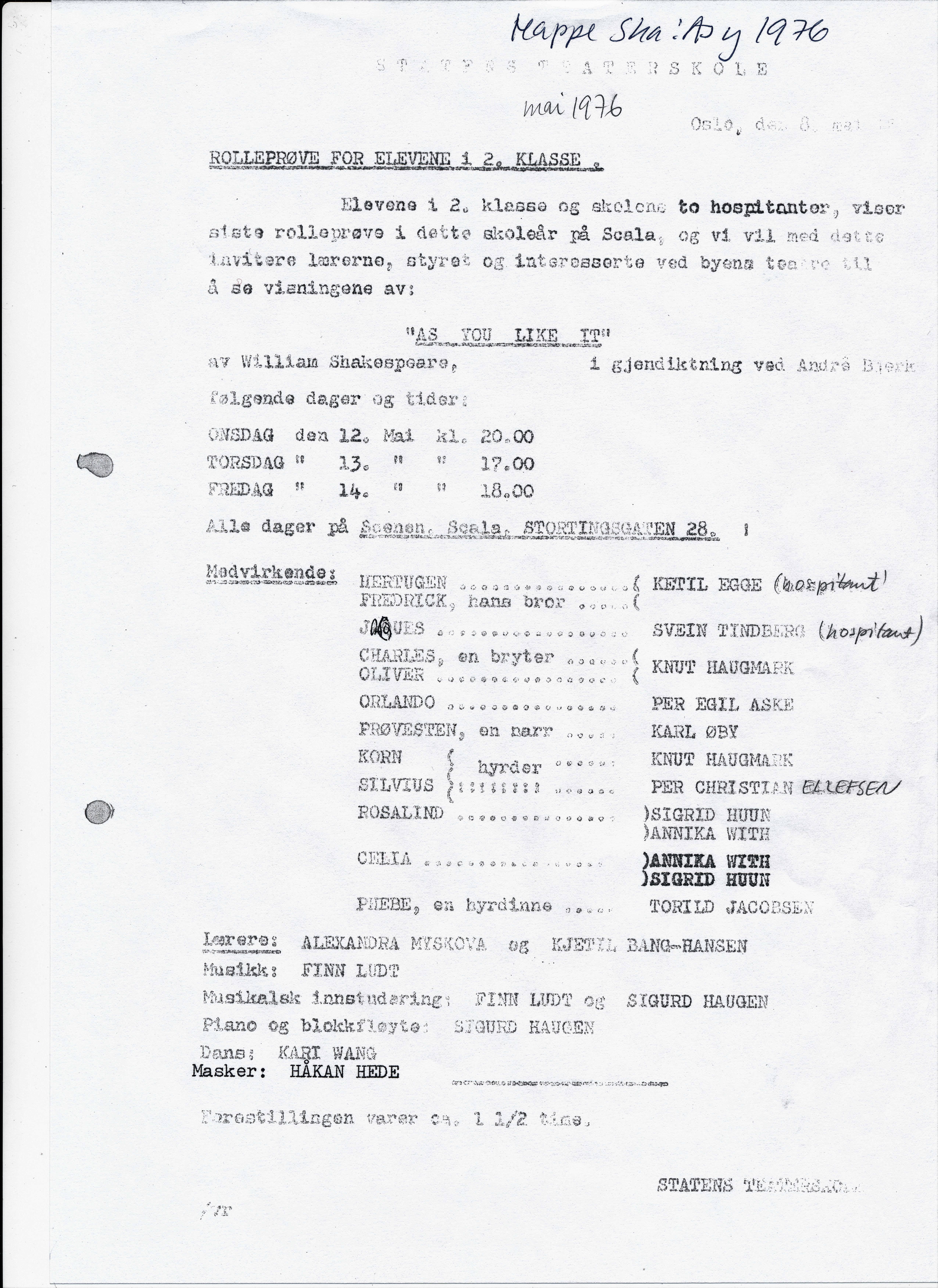 Invitasjon til Statens teaterskoles elevvisning As You Like It (1976)