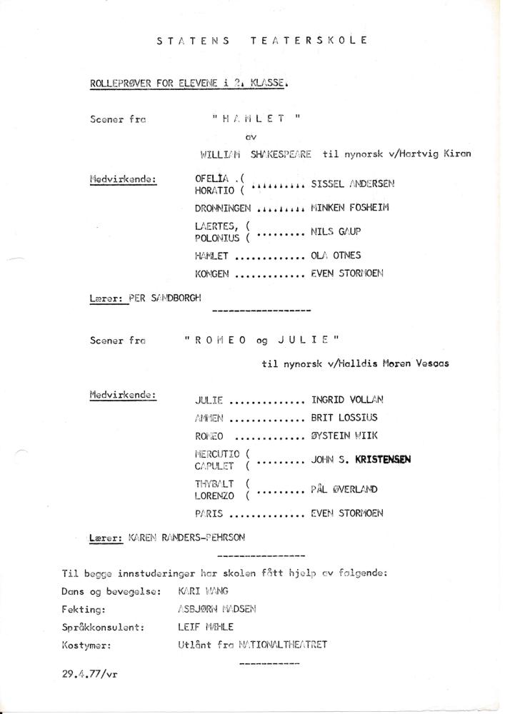 Program for Statens teaterskoles elevproduksjon Romeo og Julie og Hamlet(1977).