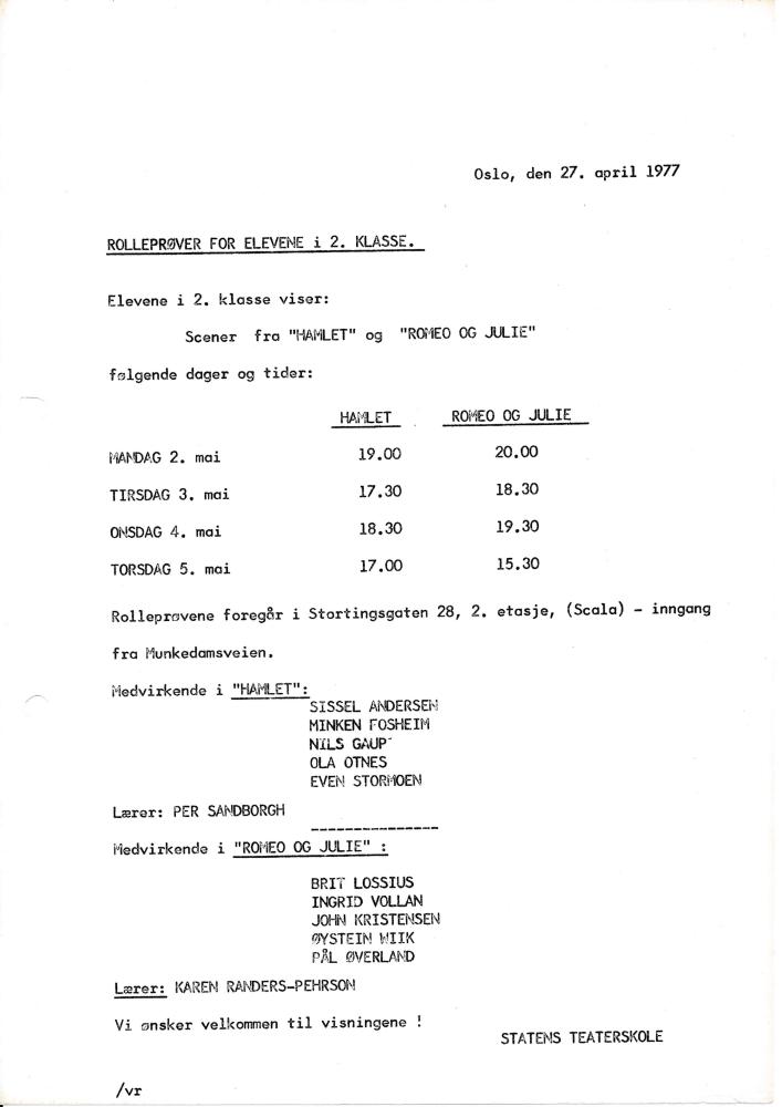 Invitasjon til Statens teaterskoles elevvisning Hamlet og Romeo og Julie(1977)
