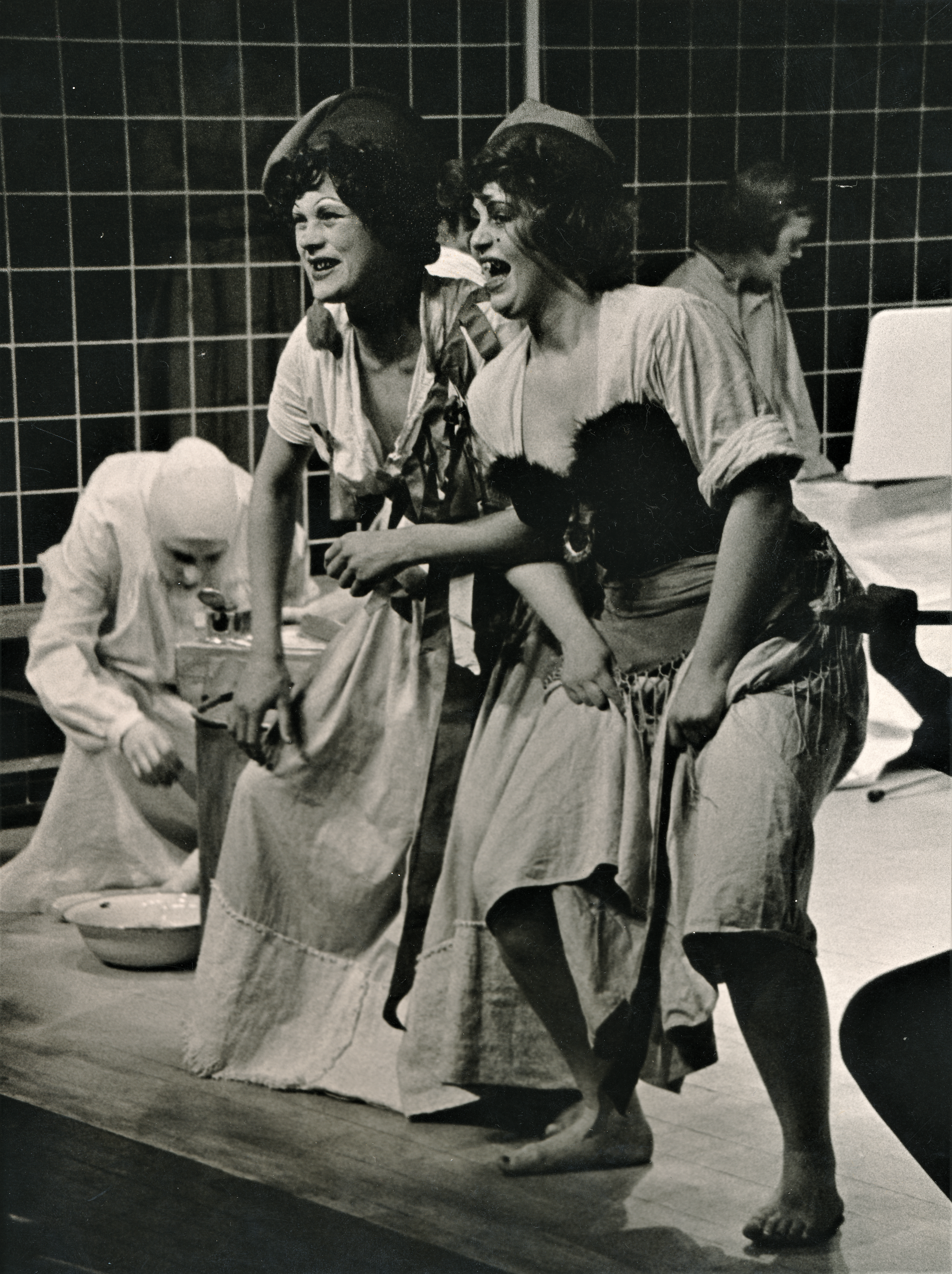 Fotografi fra Statens teaterskoles elevproduksjon Mordet på Marat (1976).