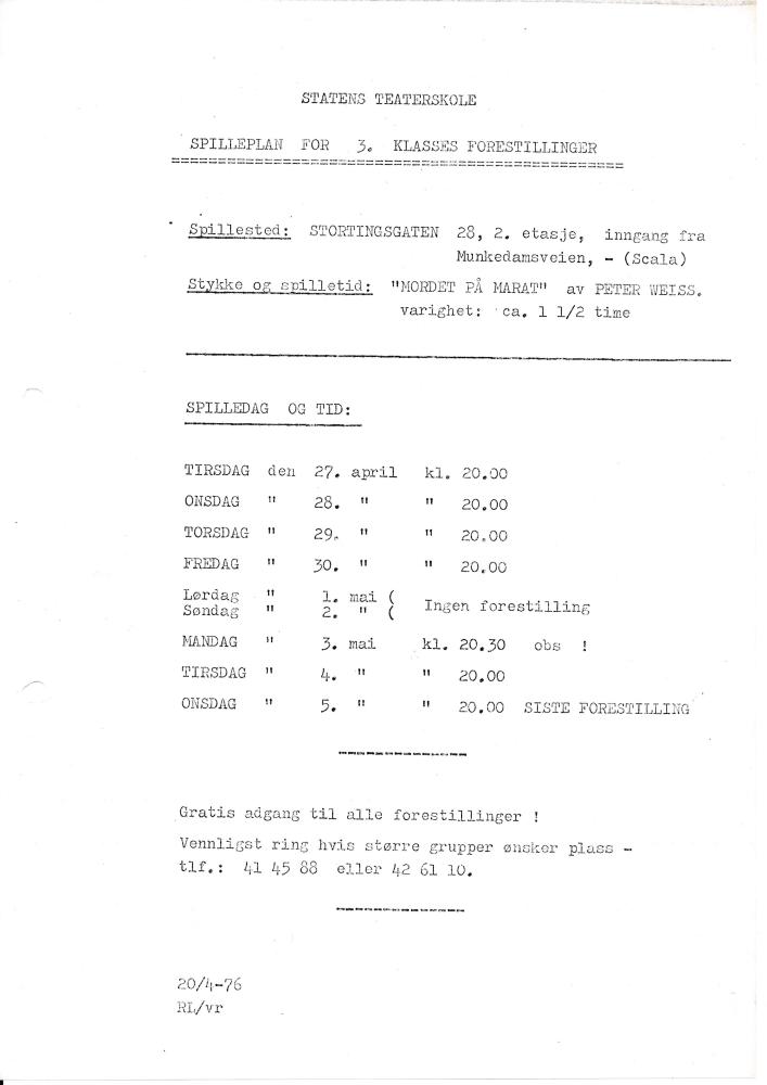 Invitasjon til Statens teaterskoles elevproduksjon Mordet på Marat (1976).