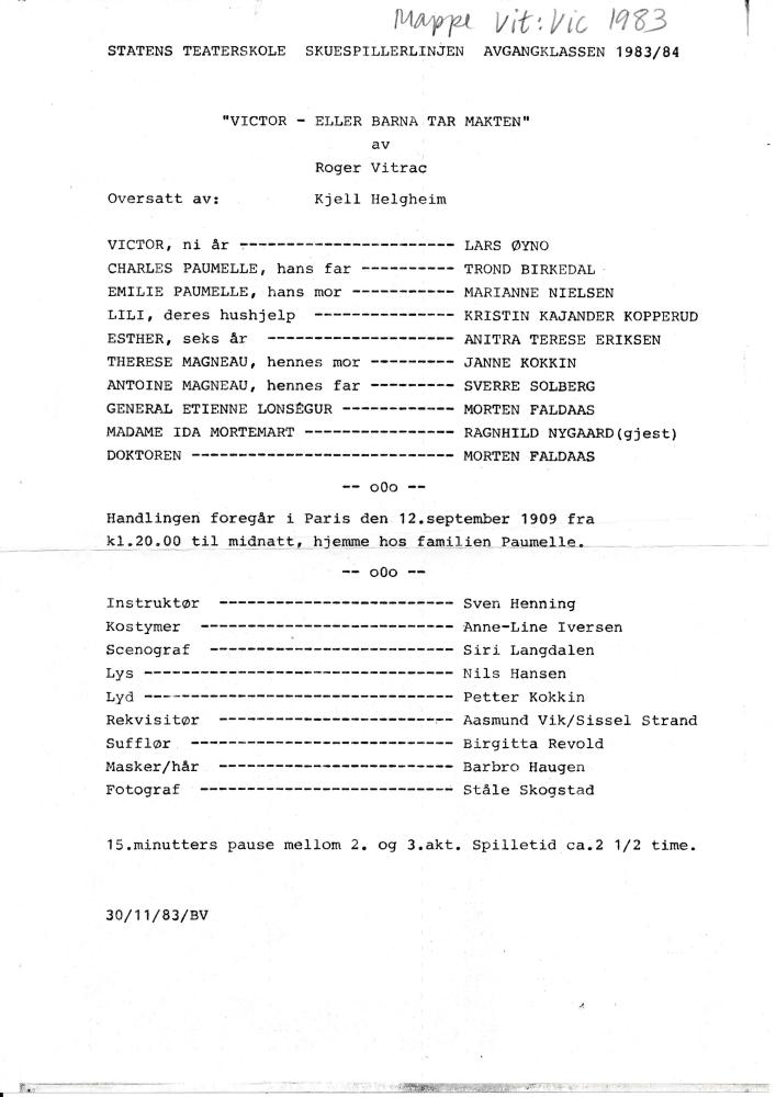 Program til Statens teaterskoles produksjon Victor - eller barna tar makten med 3.klasse skuespillerlinjen (1983).