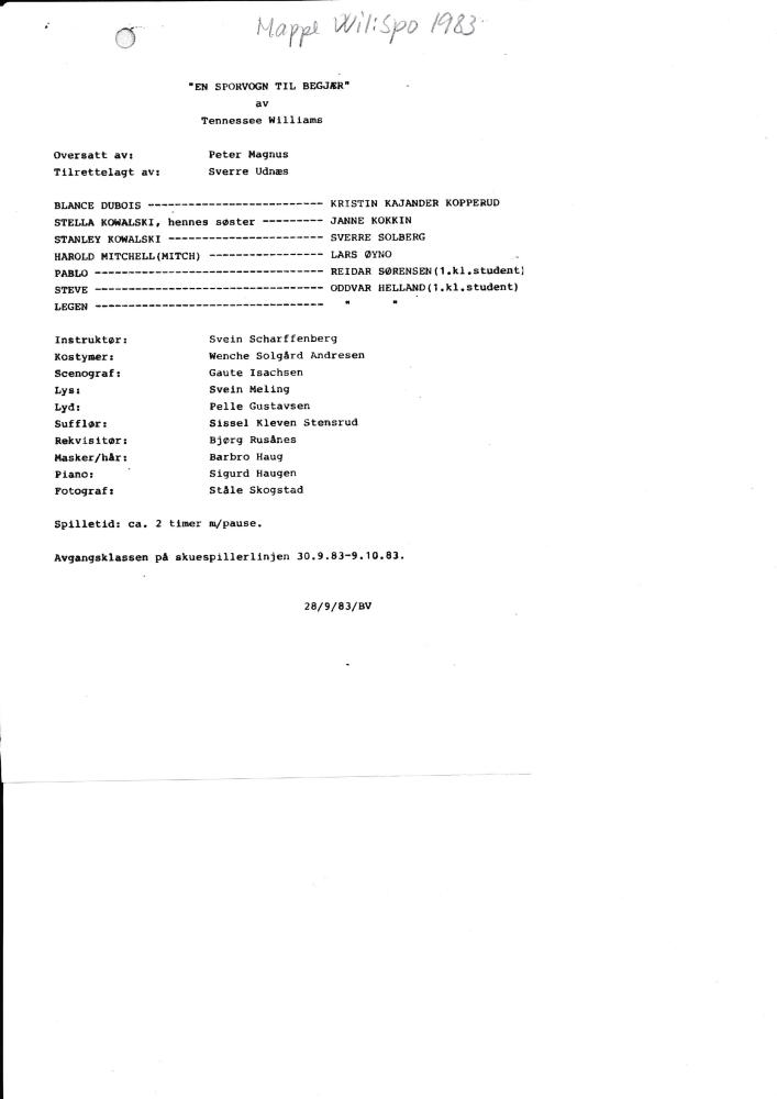 Program til Statens teaterskoles produksjon En sporvogn til begjær (1983).