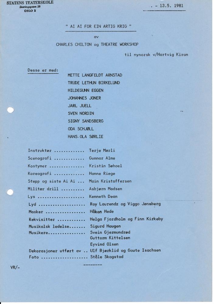 Program til Statens teaterskoles elevvisning Ai, ai, for ein artig krig (1981)