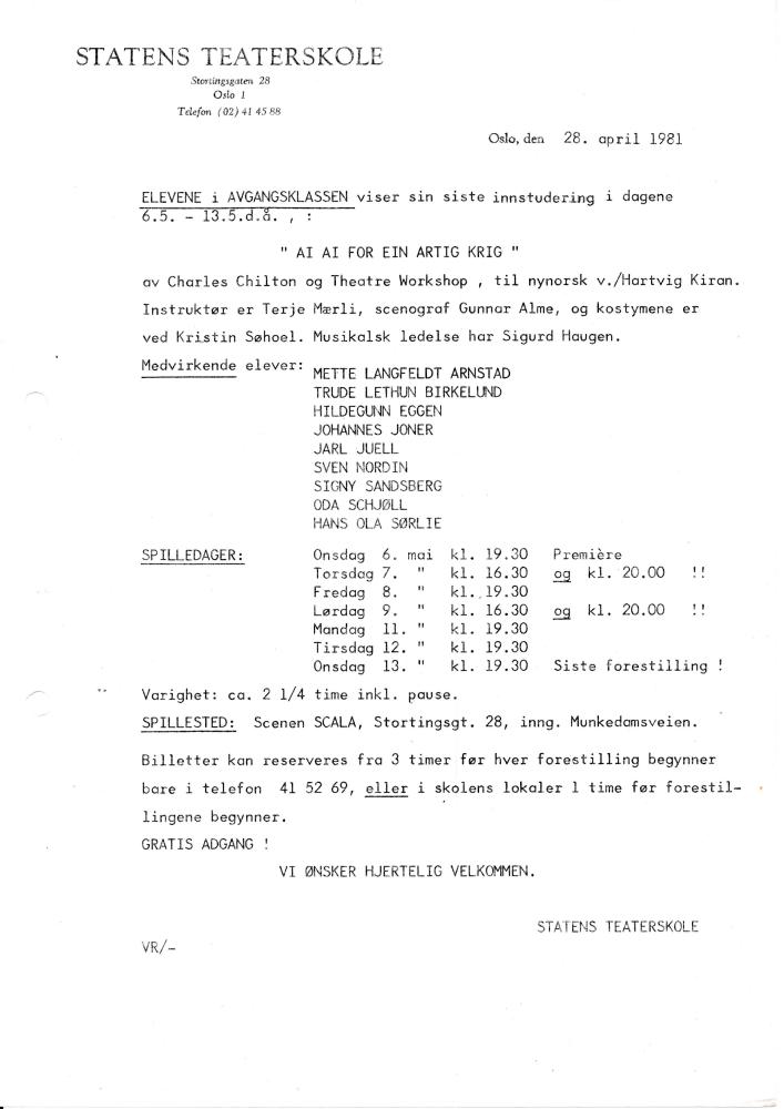 Invitasjon til Statens teaterskoles elevvisning Ai, ai, for ein artig krig (1981)