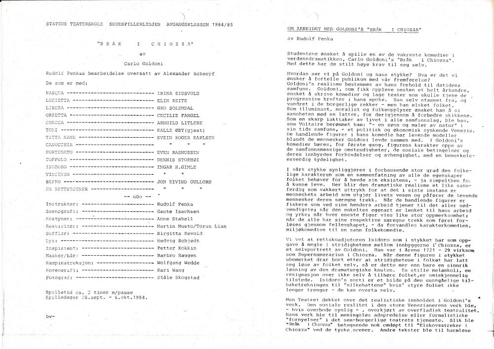 Program til Statens teaterskoles elevproduksjon Bråk i Chiozza (1984).