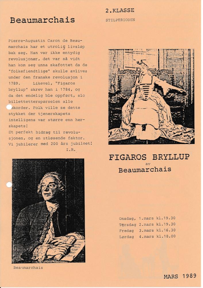 Program til Statens teaterhøgskoles produksjon Figaros bryllup (1989).