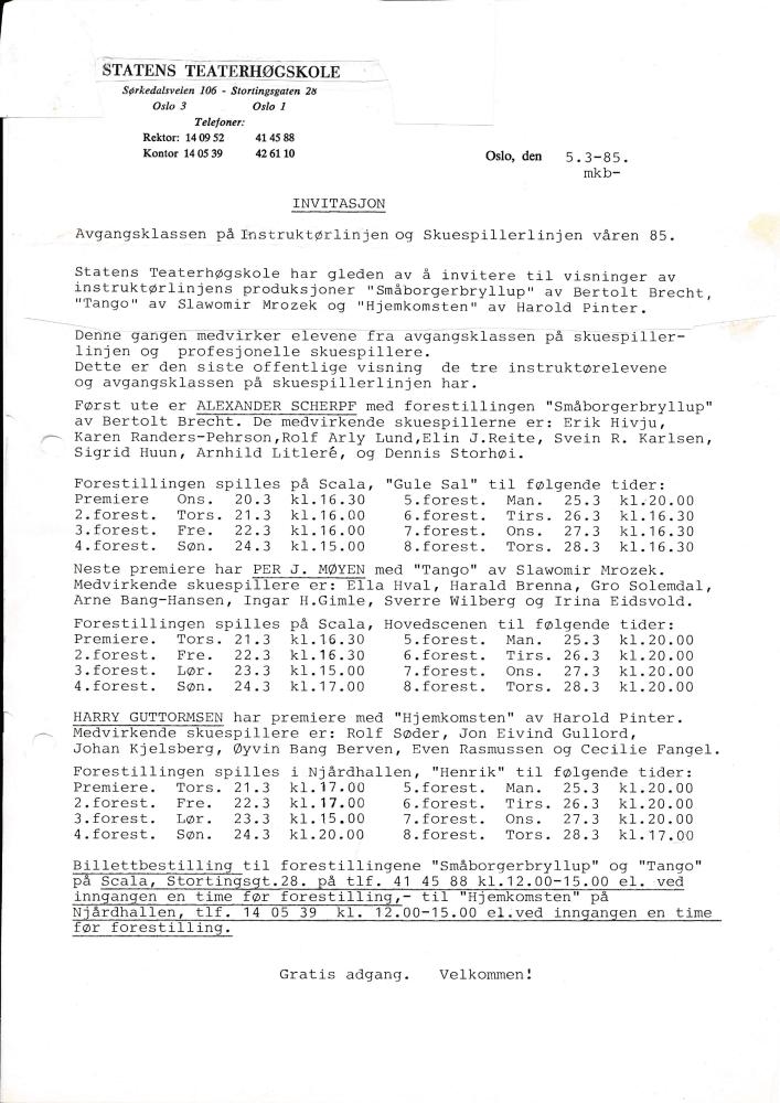 Invitasjon til Statens teaterhøgskoles produksjoner Småborgerbryllup, Tango, Hjemkomsten (1985).