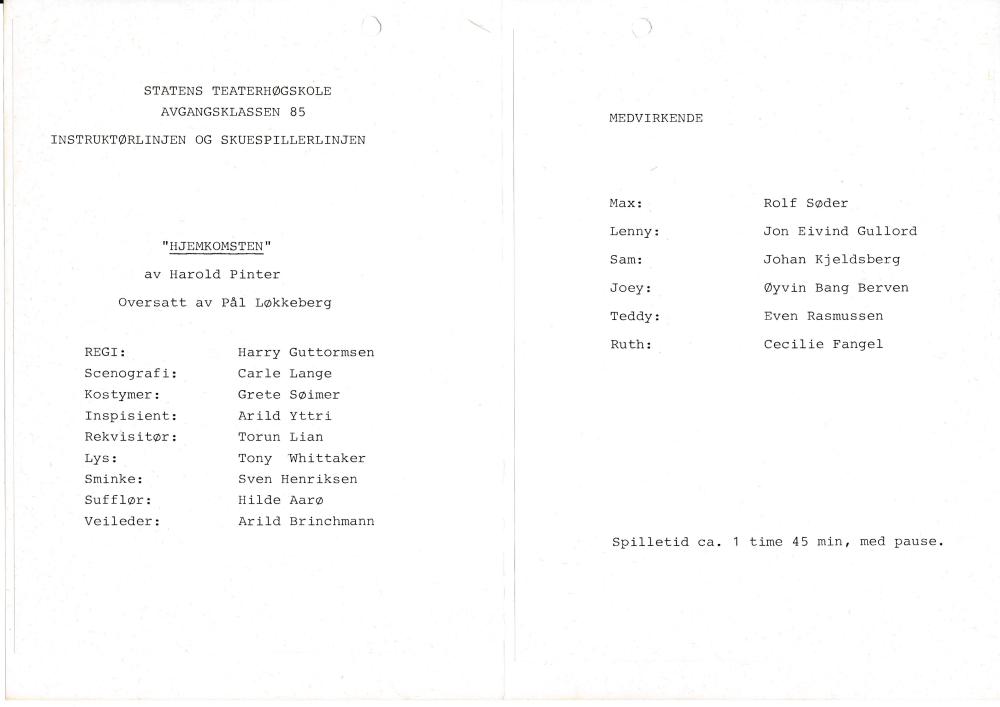 Program til Statens teaterhøgskoles produksjon Hjemkomsten (1985).