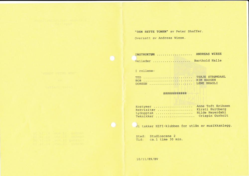 Program til Statens teaterhøgskoles studentproduksjon Den rette tonen (1986).