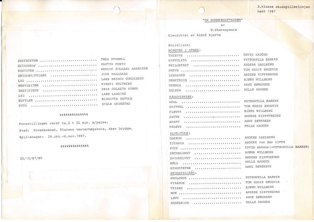 Program til Statens teaterhøgskoles studentproduksjon En sommernattsdrøm (1987).