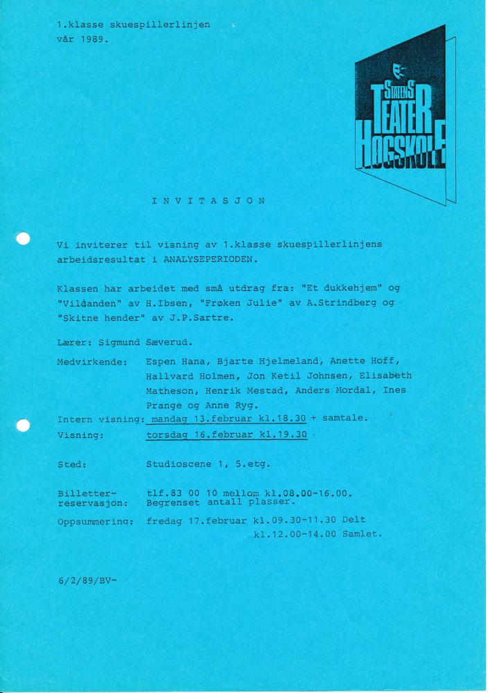 Invitasjon til Statens teaterhøgskoles Analyseperiode (1989)