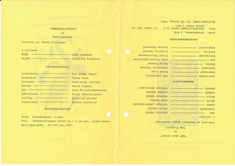 Program til Statens teaterhøgskoles produksjon Det helt store og Drømmespinneren (1987)