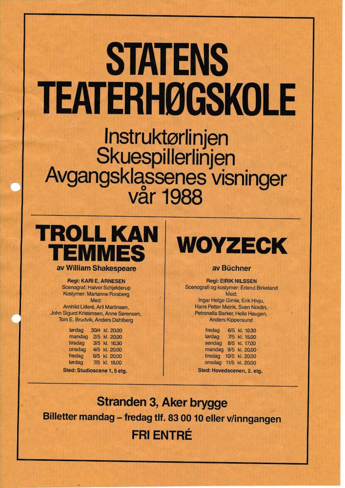 Plakat til Statens teaterhøgskoles studentproduksjoner Troll kan temmes og Woyzeck (1988).