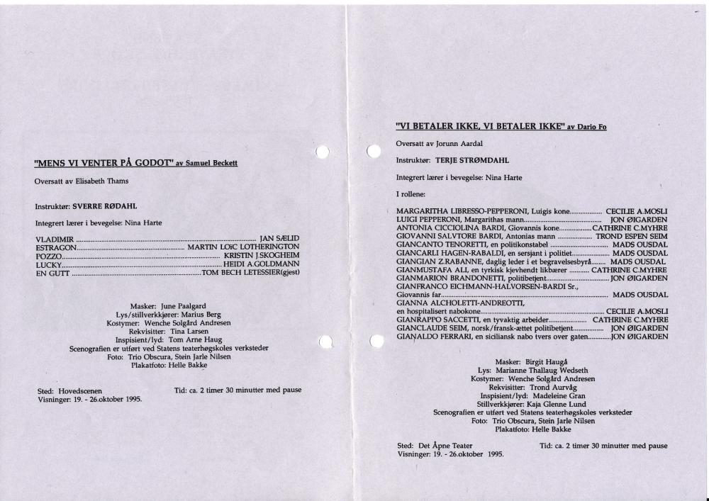 Program til Statens teaterhøgskoles studentproduksjon Vi betaler ikke, vi betaler ikke og Mens vi venter på Godot (1995).