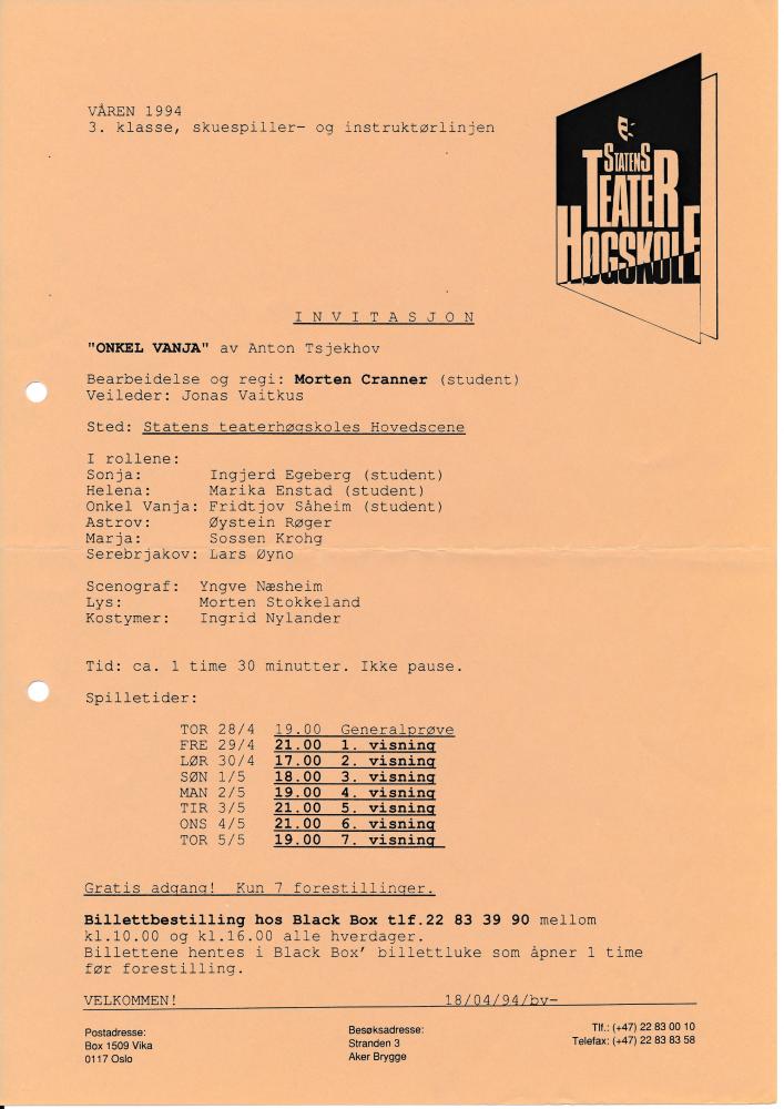 Invitasjon til Statens teaterhøgskoles avgangsproduksjon Onkel Vanja (1994)