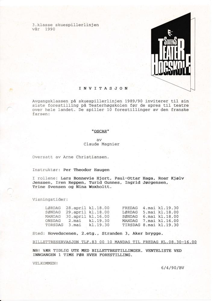 Invitasjon til Statens teaterhøgskoles studentvisning Oscar (1990)