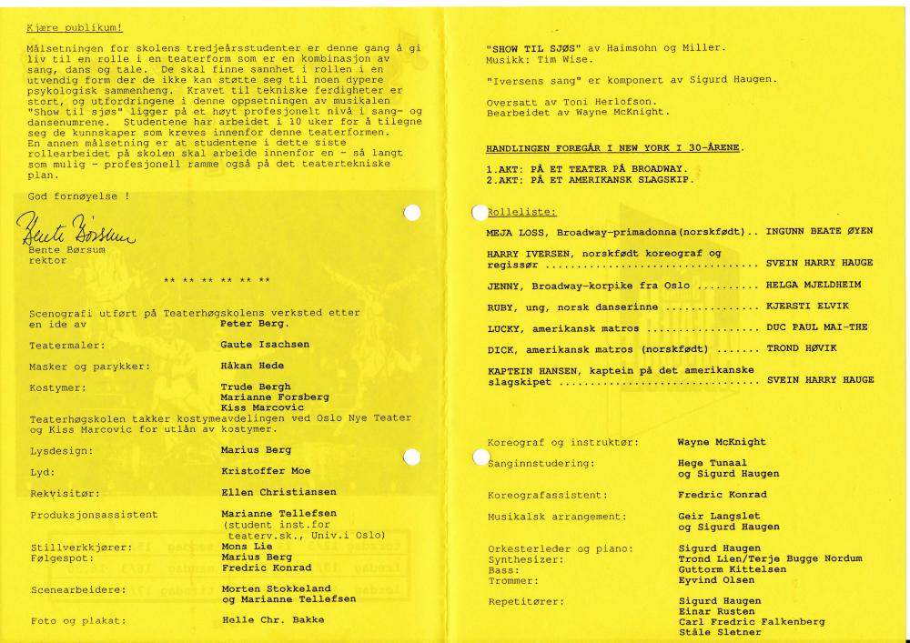 Program til Statens teaterhøgskoles studentproduksjon Show til sjøs (1992)