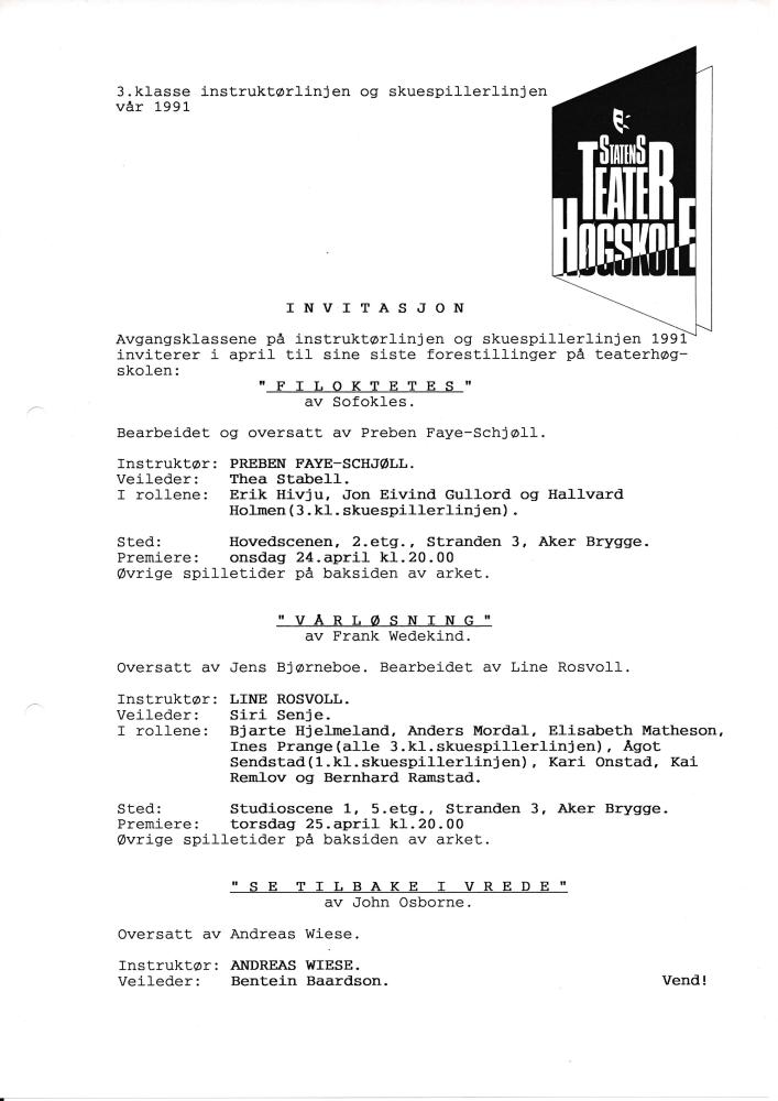 Invitasjon til Statens teaterhøgskoles avgangsproduksjoner Filoktetes, Se tilbake i vrede og Vårløsning (1991)