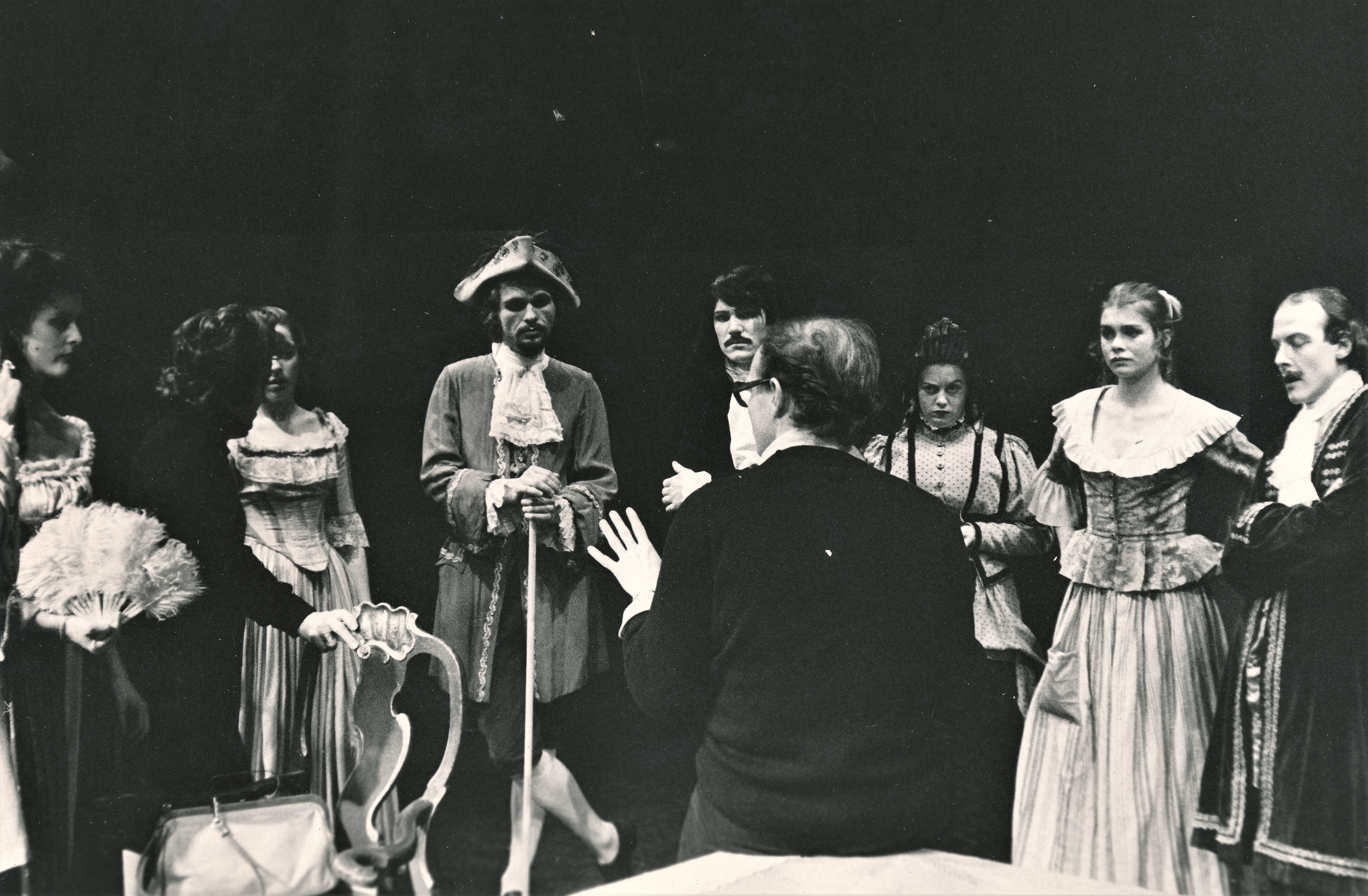 Fotografi fra Statens teaterskoles elevvisning med scener fra Tartuffe (1975)
