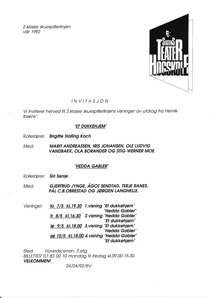Invitasjon til Statens teaterhøgskoles studentproduksjoner Et dukkehjem og Hedda Gabler (1992)