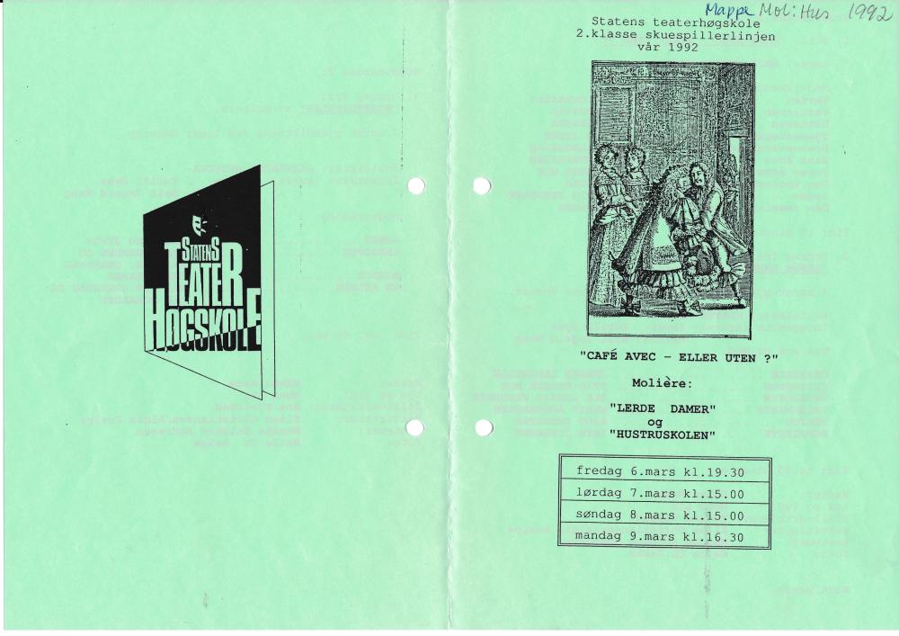 Programforside til Statens teaterhøgskoles studentproduksjon Hustruskolen, Lærde damer og stil-del (1992)