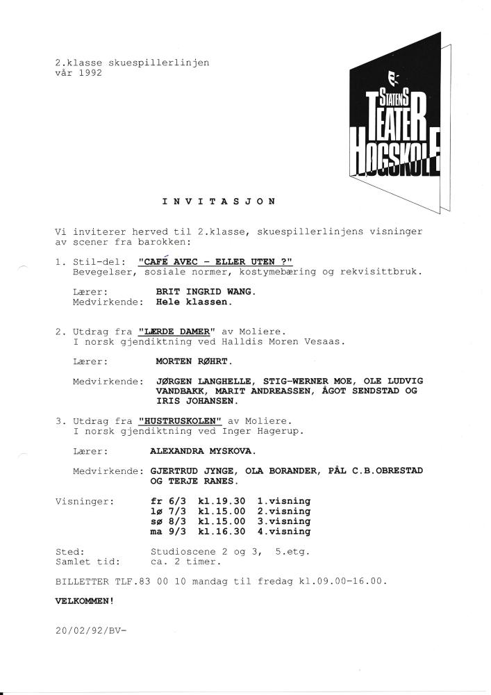 Invitasjon til Statens teaterhøgskoles studentproduksjon Hustruskolen - utdrag (1992)