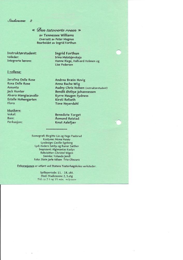 Program til Statens teaterhøgskoles produksjon Den tatoverte rosen (1997)
