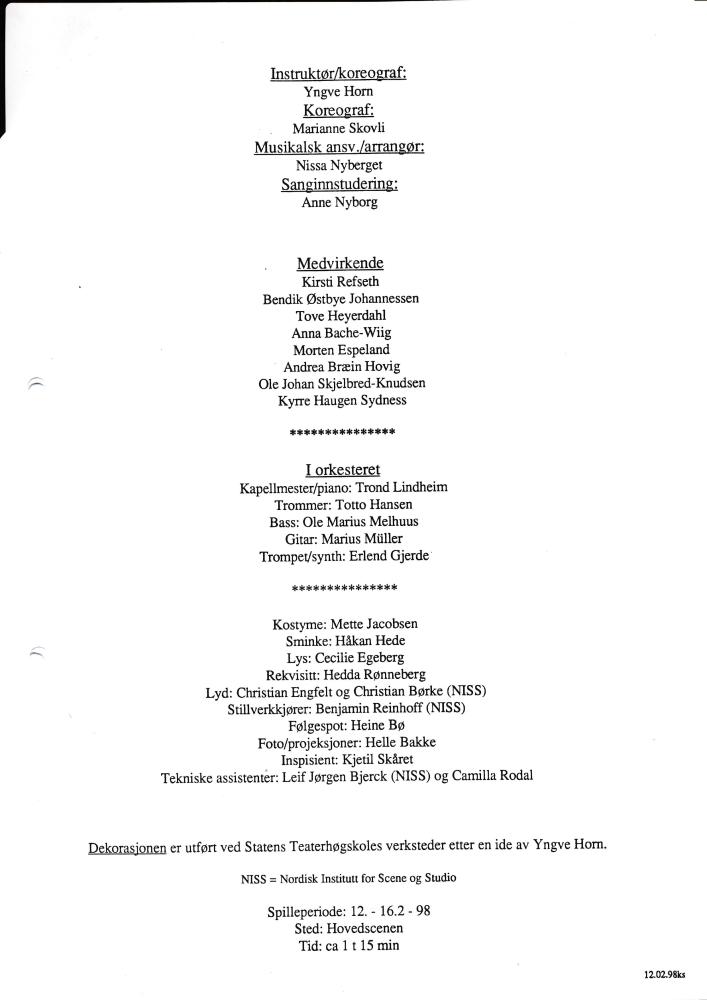 Program til Statens teaterhøgskoles studentproduksjon Remember My Name (1998)