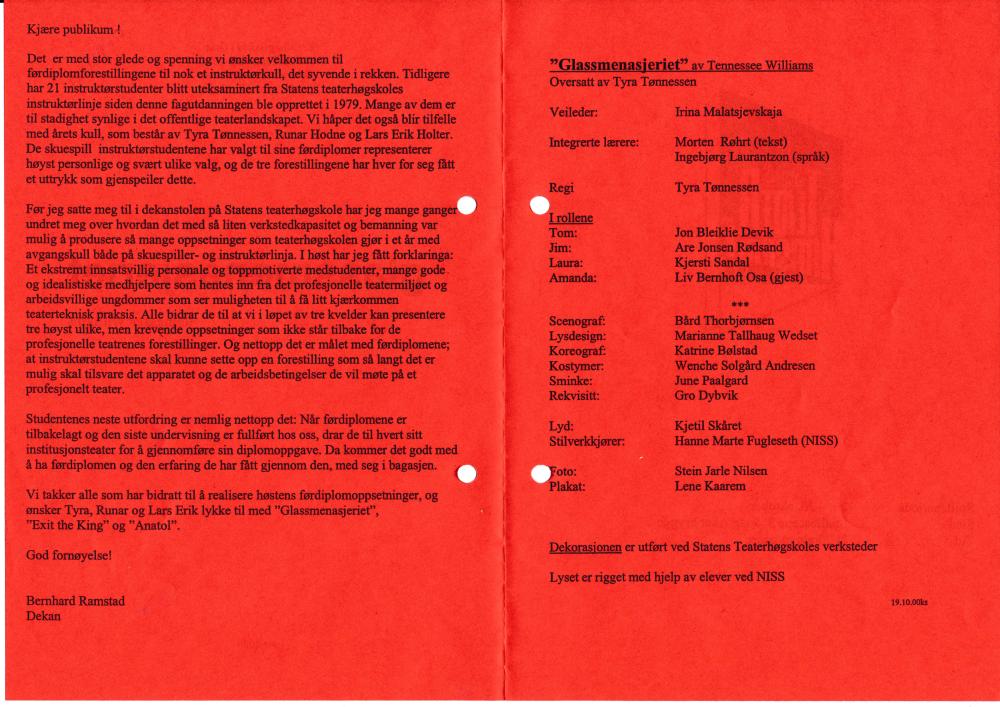 Program til Statens teaterhøgskoles studentproduksjon Glassmenasjeriet (2000).