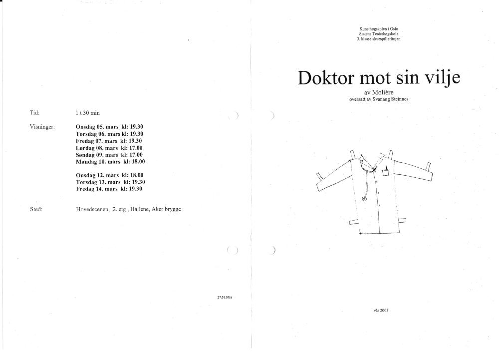 Programforside til Statens teaterhøgskoles studentproduksjon Doktor mot sin vilje (2003).