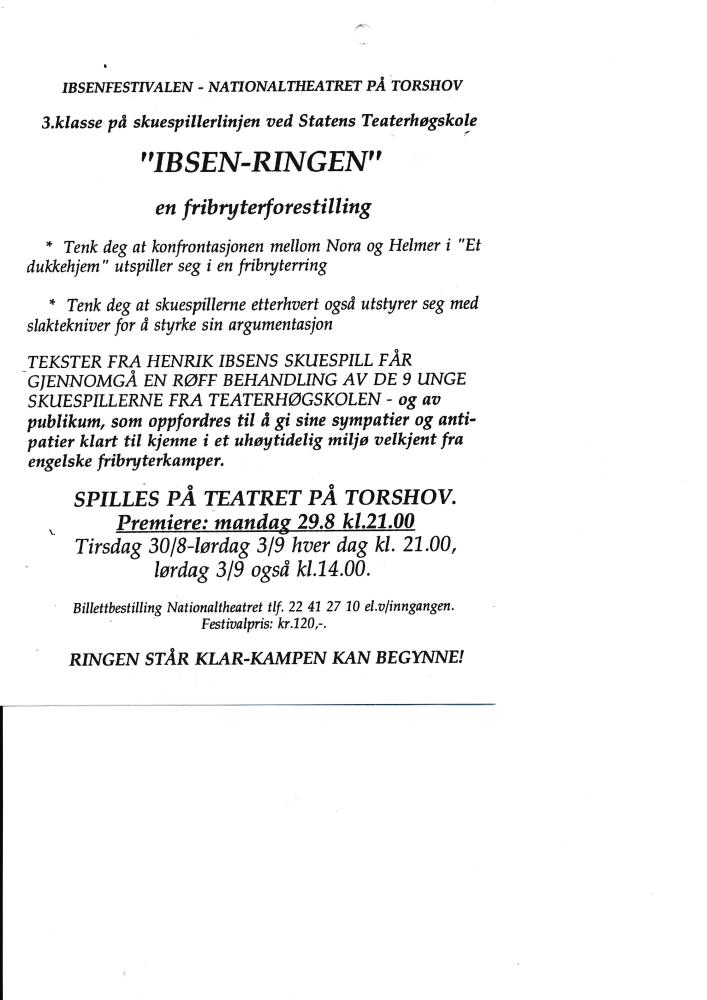Flygeblad til Statens teaterhøgskoles studentforestilling på Ibsenfestivalen, Ibsen-ringen(1994)