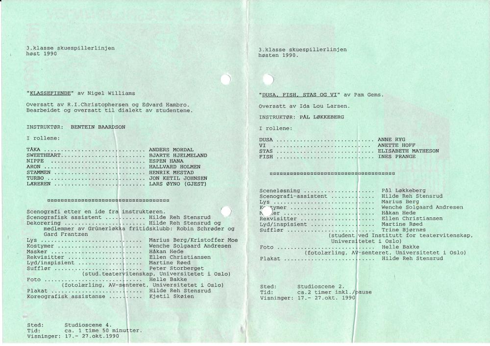 Program til Statens teaterhøgskoles studentproduksjon Klassefiende (1990)